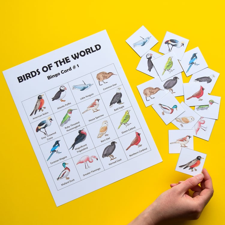 This bird bingo printable game features 48 species of birds from around the world. Spot all kinds of birdsfrom a sparrow to a bald eagle and from a peafowl to a kiwi bird. FREE Bird Bingo Game Printable.