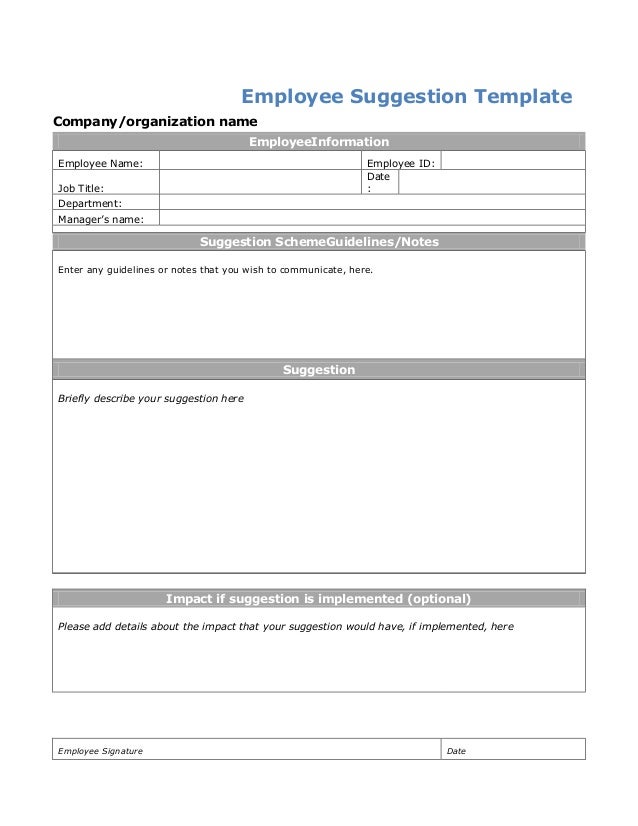 A suitable template can help the HR post a vacancy to employment agencies and effectively manage the current relations with the employees. We have 15 images about Employee Suggestion Form Template Free Download including images pictures pdf wword and more. Employee Suggestion Form Template Free Download.
