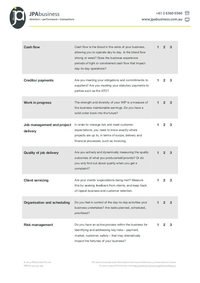 A good accountant or book-keeping routine is also invaluable and can help identify areas you may have overlooked when managing your business finances. If you want a digital version of the questionnaire or a printed document this is the most suitable template. If youd like some expert advice you can book in a free business financial health check with us by contacting your local Business.