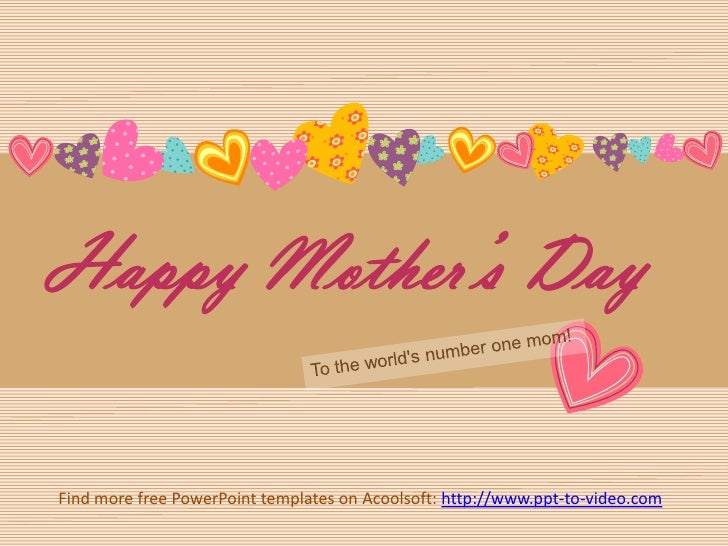 Free mother's day powerpoint templates - Our free Mothers Day presentation template can be used for Mothers Day presentations or digital signage. If you are looking for beautiful ppt templates for Mothers day PowerPoint presentations then this Mothers day background is for you. I love you Mom. The free Mothers Day PowerPoint Template has a blue background. Mothers Days Template Slides. Show Mothers Day specials and advertising. As it happens with Fathers Day its held on different dates depending on the country. Download Free Mothers Day PowerPoint Greeting Card Template. Download free Mothers PPT Backgrounds. The 1 source for templates downloads easy to customize without graphic design skills.