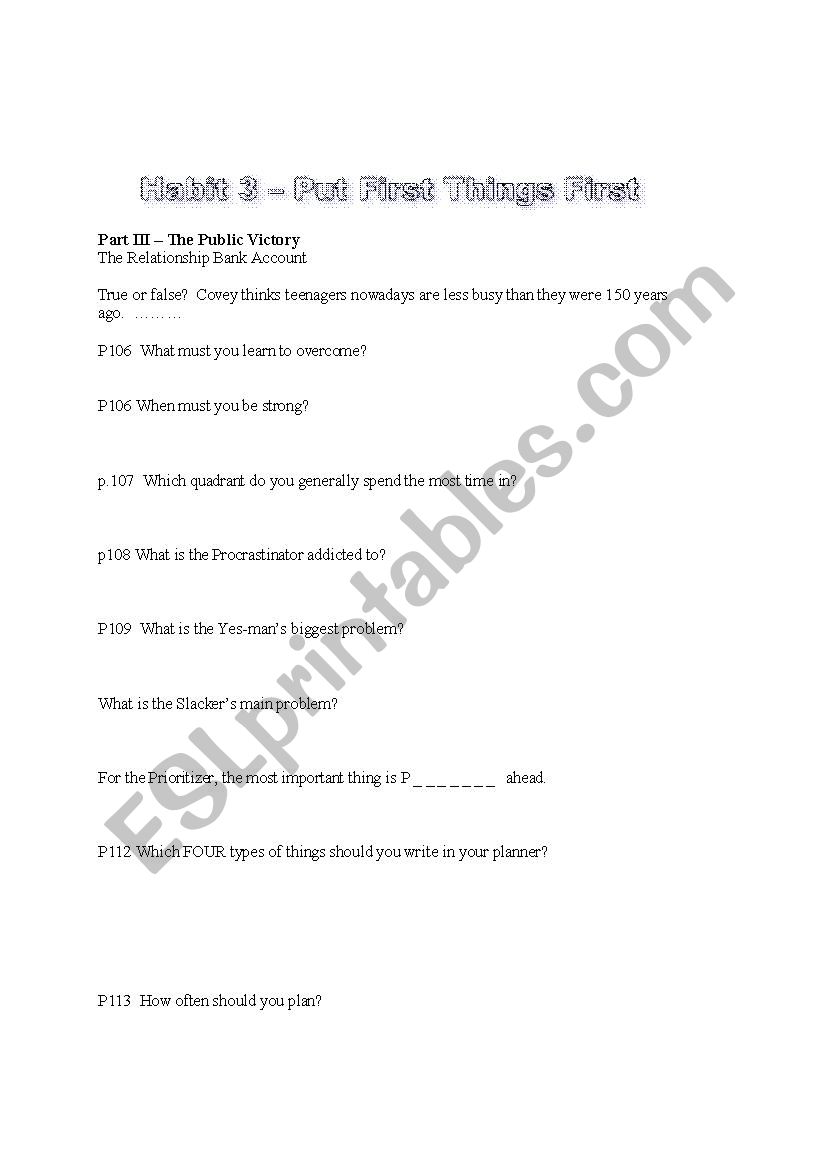 The 7 Habits Of Highly Effective Teens Esl Worksheets Habit 3 Put First Things First Esl Worksheet By Chris Herring